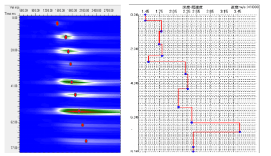波速扫描图像中的每个能量极值点都代表一个散射界面。极值点的纵坐标为界面的双程时,横坐标为界面上覆地层的平均波速。很容易由此计算出极值点对应的界面深度和层速度曲线(图1d),这就实现了由炮点记录到垂直波速曲线的转变。曲线中显示了各界面的深度与地层的波速分布。