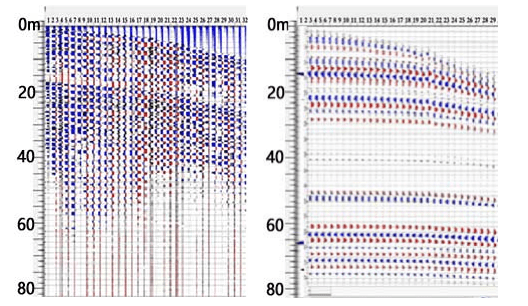 (a) 地震采集的原始资料 (b) 双曲滤波后去除多次波