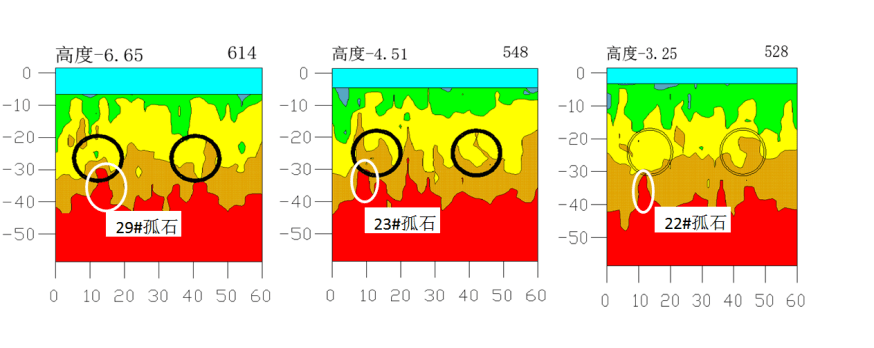 3) 对孤石的勘探,重点是建立三维速度结构,以波速大于2400m/s为指标,搜索每一个
