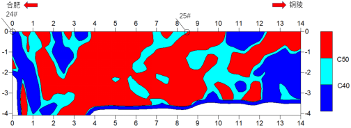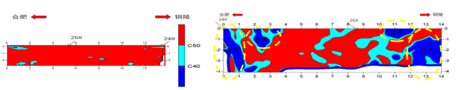 根据实验对照,将其中速度>4300m/s,认为C50以上混凝土强度,用红色表示;速度<4200m/s,为C40以下混凝土强度,用蓝色表示;速度在4200m/s~4300m/s,为C40-C50过渡区,用浅蓝色表示,形成强度云图,以反映粘钢加固区域混凝土内部异常。从图12中可以看出此段发现混凝土内部存在缺陷。当波速值<4200m/s,且面积>1㎡,判定混凝土内部可能还存在损伤,即粘钢加固效果不好。
