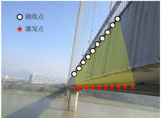 采用对测法观测,首先将检波器布置在顶板最外侧,然后采用梁下检查车,在π型梁内侧的不同截面处依次激发(如图9所示)。每个截面都是对测法观测。