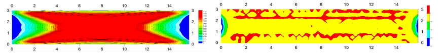 将不同波速区间用彩虹色色标进行区分,以红色为高波速区域,绿色为中间波速段,深蓝色体现低速区域,形成被测区域波速云图,以体现混凝土内部情况,对应图3和图11中可以看出,混凝土有过破损掉块,波速较完整处低,存在从外向内发育的低速松散区,需要修补。