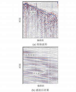 拉姆波的能量比体波的能量大得多,是混凝土结构检测的主要干扰源。其频率较低,波速低于横波与纵波速度;波场分离使用视速度滤波方法滤除拉姆波,提取出散射波。滤波参数选择保留视速度3800m·s-1以上即可(与混凝土波速有关)。图1所示为滤波前后的结果对比,从中可以清楚地看出滤波的效果。