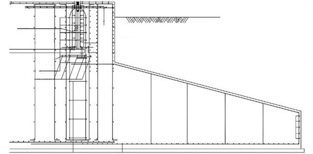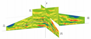 经数据坐标编辑、滤波处理,每个记录取震源附近的少数记录(不超过11道),联合偏移成像。得到东西南北4条剖面如图8所示,图中底部3m左右的红色界面是混凝土构件底部界面,界面很清楚,位置基本正确。图8中80cm1m范围内不同程度的红色条纹,表示存在低速界面,可解释为浇筑中的冷缝。将所有测线成果拼接起来,进行三维展示(见图9),从图中可以看出二次浇筑界面清晰、连贯。