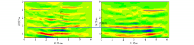 从图4中可以看出波速约为3800m·s-1,混凝土中界面清晰。除了地界面之外,还有内部界面,疑是存在冷缝 (施工间歇面)。