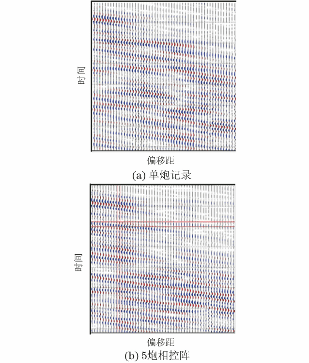 单点激发和相控阵激发效果对比如图2所示,可见单点激发产生的波场向下呈广角辐射,能量在下方的照度分布是分散的,信噪比和横向分辨率都很低;相控阵是将震源规则排列,控制相位发射,在一定范围内形成相干加强。