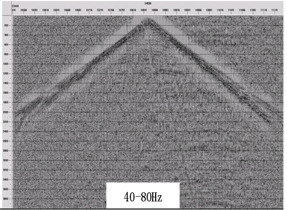 (1)获得的地震资料中浅层信噪比较高,2.5s以上可见较强的反射信息,记录的有效频带可达80Hz;