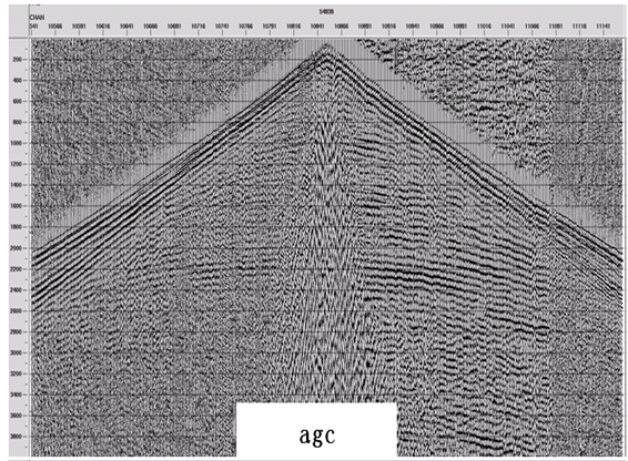 通过电火花震源的激发,可以获得4s以上的地震反射资料,将得到的地震数据解编,获得单炮记录,如图3所示,从电火花震源激发的单炮面貌来看,中浅层信噪比较高,2.5s以上可见较强的反射信息,干扰波方面可以看出面波干扰较为严重,遮挡了一部分有效波的信息,水库上地震勘探干扰主要来自于水流、反射和波浪,干扰较强,信噪比较低,影响地震勘探效果。