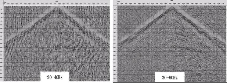 为了去除干扰波的影响,程度的凸显有效波,采用分频滤波方式,得到不同频率范围内的单炮记录,如图4所示,可以看出可记录的有效频带可达80Hz。在一定的频率范围内,可以获得更加清晰的有效波及有效信息。20-40Hz频率范围内有效波保存较好,干扰波去除一部分,但仍有较明显的存在,30-60Hz频率范围内,干扰波进一步减少,有效波与上一频率相比也有所减弱,40-80Hz频率范围内,干扰波较少,基本去除了面波的干扰。在实际应用中,可以根据地质勘探需求选择有效信息更多、干扰信息更少的频率范围进行分析,提高信噪比,获得分辨率更高的部分。