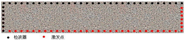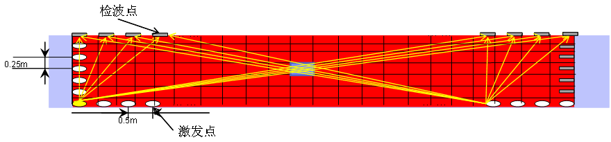根据上述三条原则,对于长方形梁体CT截面,检测系统设计为L形观测系统。将检波器布置在长方形一侧长边及相邻一短边,成L形;激发点布置在另一长边和短边,形成另一L形,两L形构成封闭长方形。检波器间距、激发点间距、单元网格间距相等。此观测系统效率高,同时满足射线密度、正交性和射线条数大于单元数这三项要求。