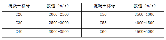 混凝土的声波速度可作为混凝土密实性和强度评价的定量指标。由于不同地区沙石骨料的差异,波速与混凝土强度的关系会有少许的差别,但总的规律不会改变。在河北地区的高速公路桥梁混凝土标号与波速的试验关系如下表。