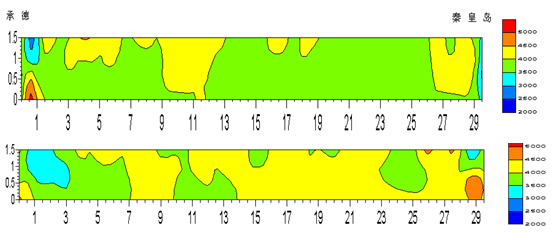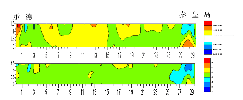 图8上、下两幅图分别为右幅27-2T梁顶板和腹板的波速CT结果,图像绝大部分为绿色和黄色高速区,表明梁板强度基本达到C50的设计要求,且浇注均匀性良好。但在靠距秦皇岛端有长约2m的局部蓝色低速区,总面积约4m2,密实度不足,强度低于C50,推测端部震捣不够。
