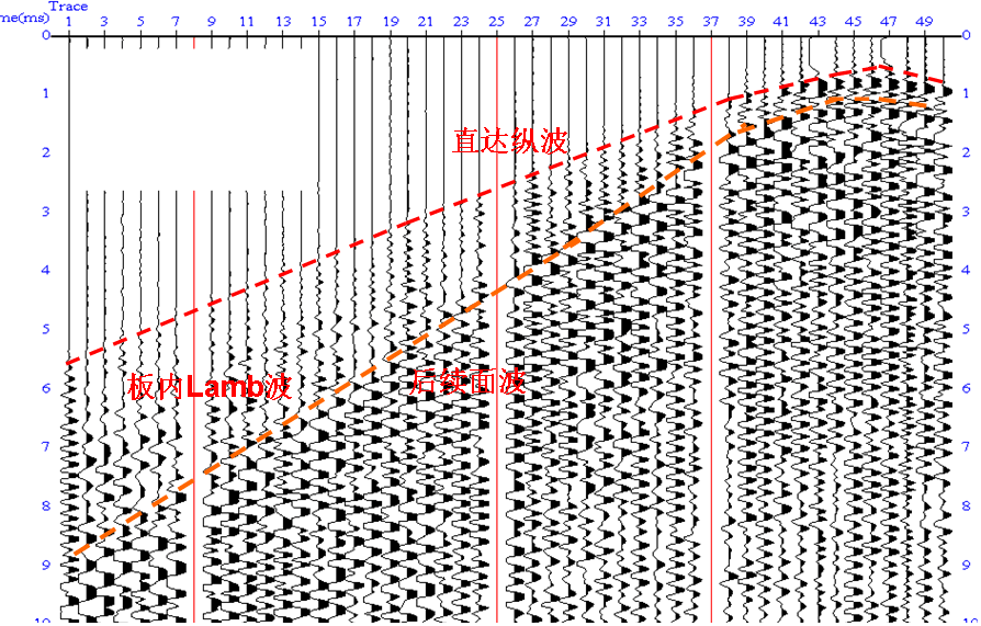 图6是实际检测记录,由记录可清晰地看出到达的直达纵波以及后续到达的横波和Lame波。桥梁CT使用直达的波纵走时,记录到时清晰,干扰少,读取准确。