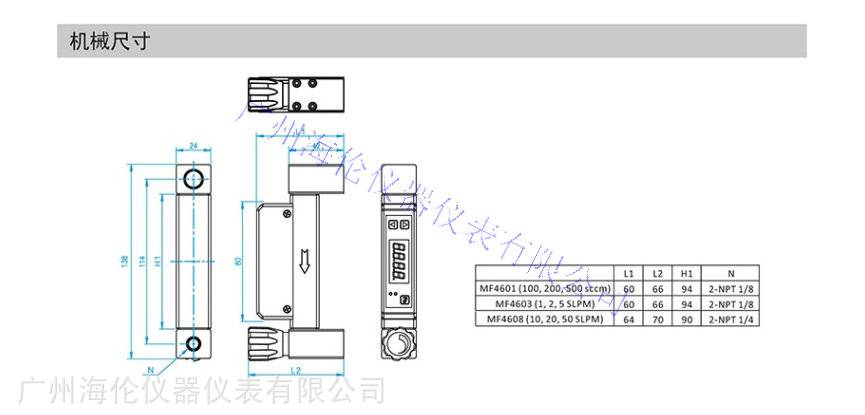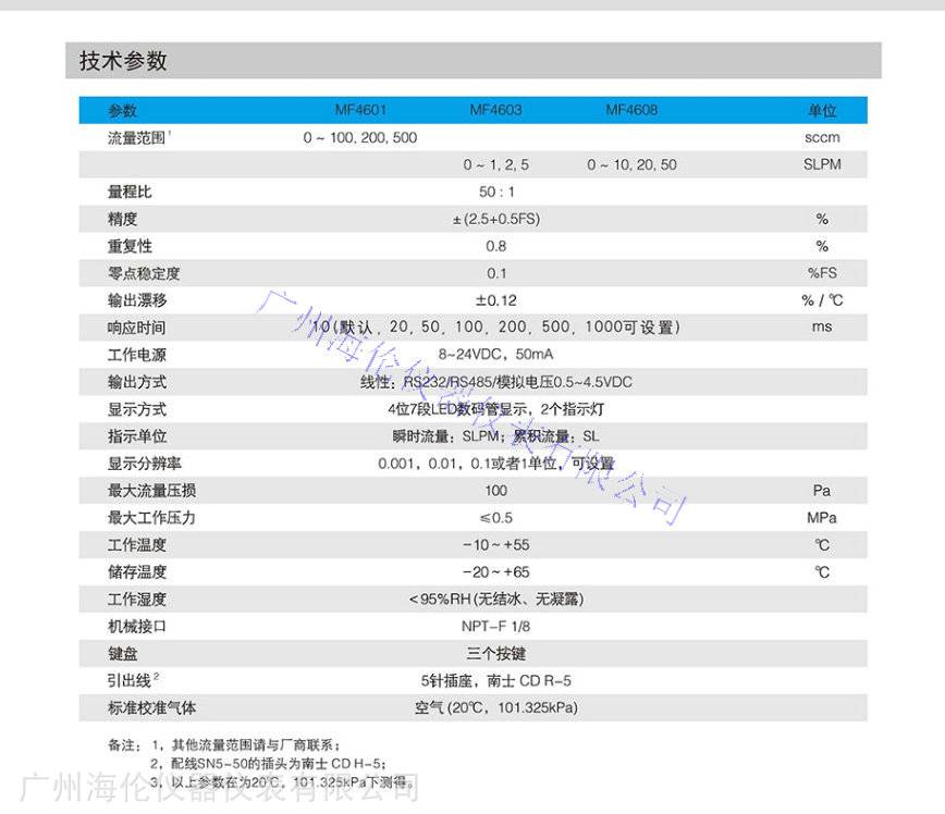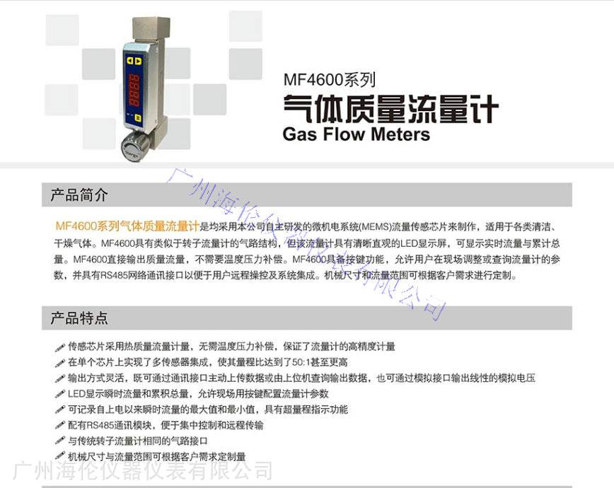 MF4600系列气体质量流量计是均采用本公司研发的微机电系统(MEMS)流量传感芯片来制作,适用于各类清洁、干燥气体。MF4600具有类似于转子流量计的气路结构,但该流量计具有清晰直观的LED显示屏,可显示实时流量与累计总量。MF4600直接输出质量流量,不需要温度压力补偿。MF4600具备按键功能,允许用户在现场调整或查询流量计的参数,并具有RS485网络通讯接口以便于用户远程操控及系统集成。机械尺寸和流量范围可根据客户需求进行定制。