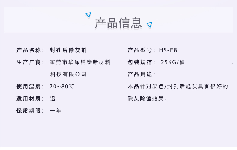 本品针对染色/封孔后起灰具有很好的除灰除镍效果,是压铸铝阳极氧化、工业打蜡抛光清洗处理及封孔后铝合金除灰的理想选择。