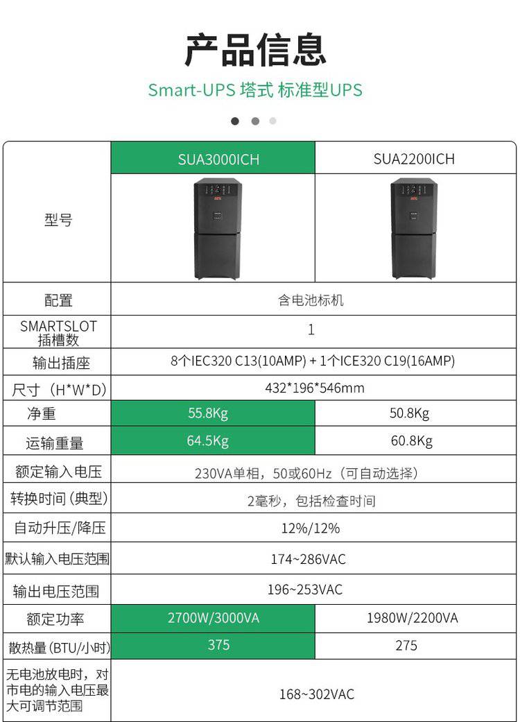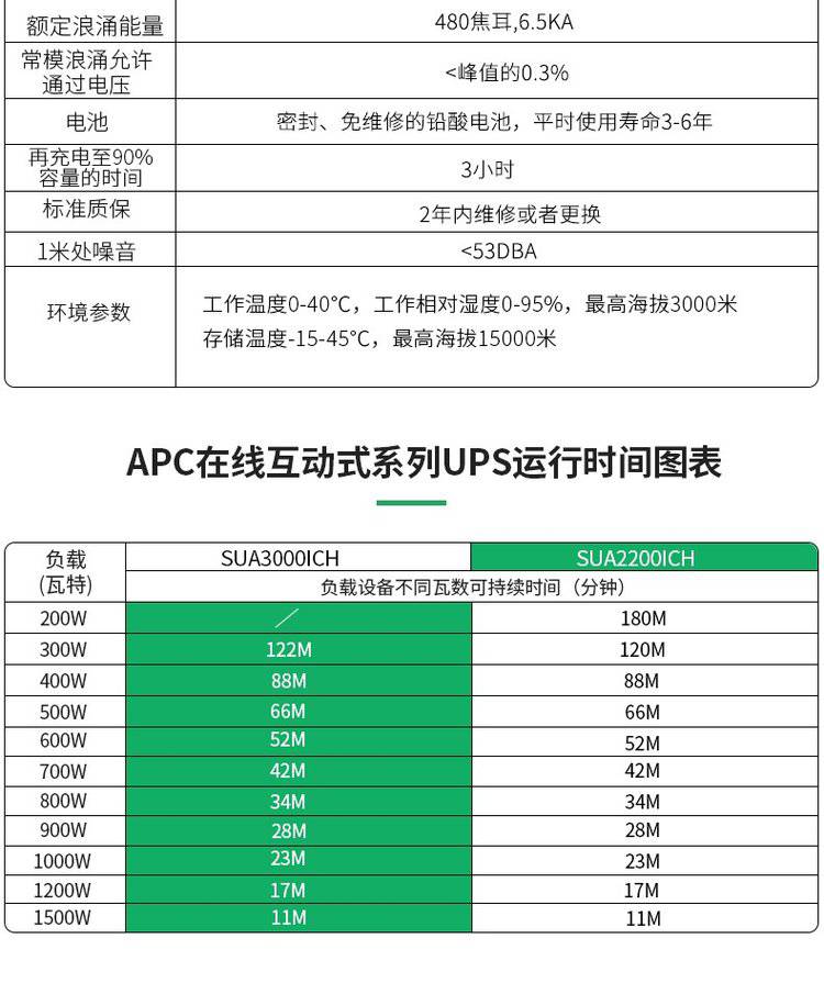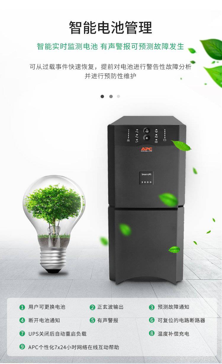 获得专利的绿色运行模式能够实现超过97%的效率。Smart-UPS是个通过能源之星认证的网络UPS。由APC公司首创的智能电池管理可通过智能化、的温度补偿充电来限度地提高电池的性能并延长其寿命。动态更换电池时间指示器和自动自检能够保证电池的可靠性并可在需要更换之前事先发出警告。方便、易于连接、可热插拔的电池模块无需断电就可进行电池更换。APC公司设计和制造Smart-UPS的历史已超过23年,Smart-UPS是世界上最值得信赖的网络UPS,累计销量已超过2500万台。