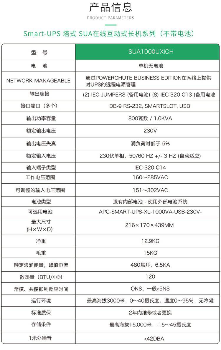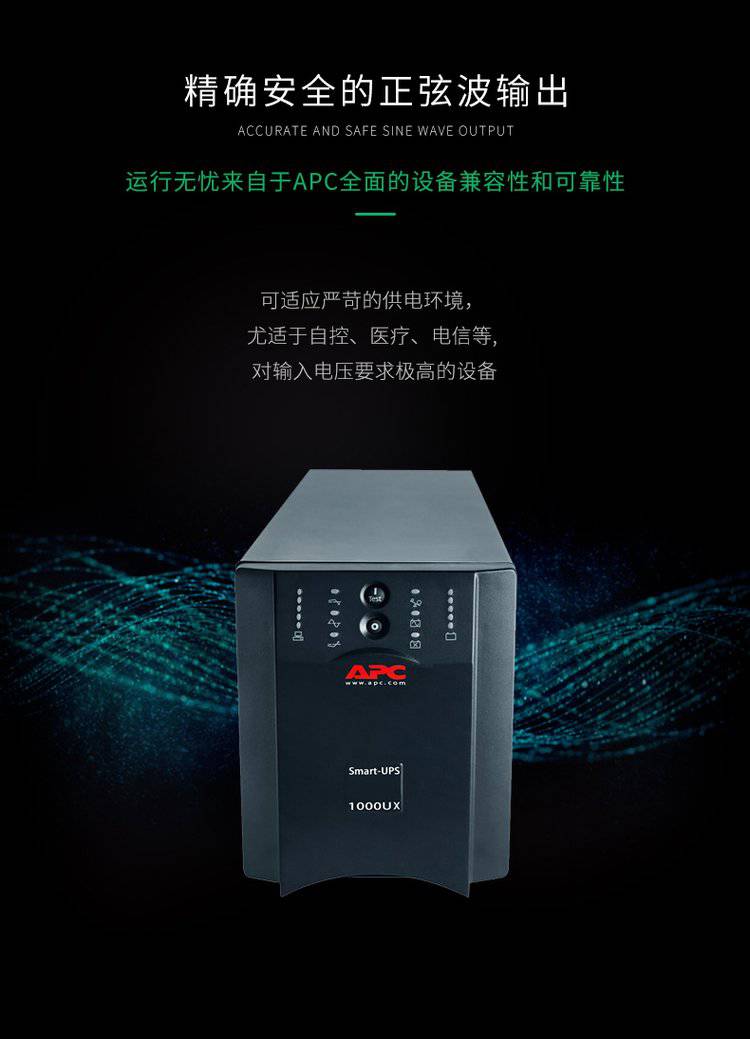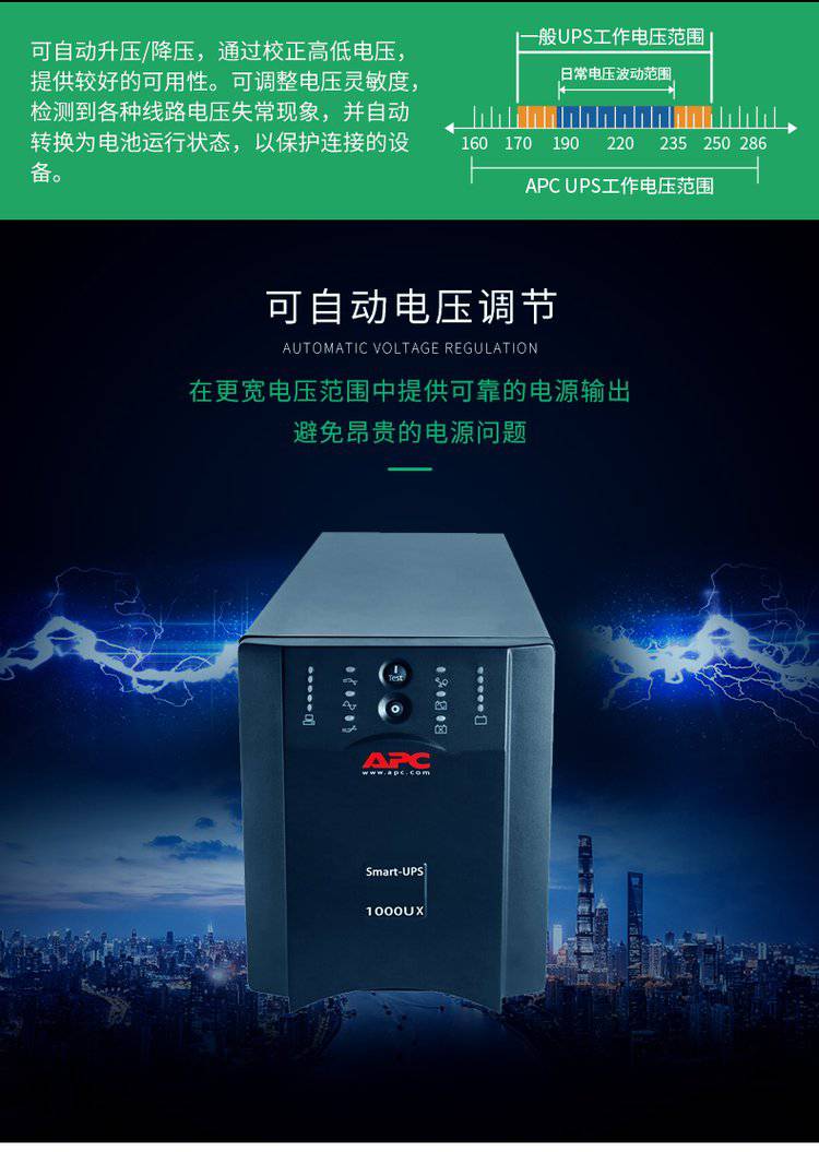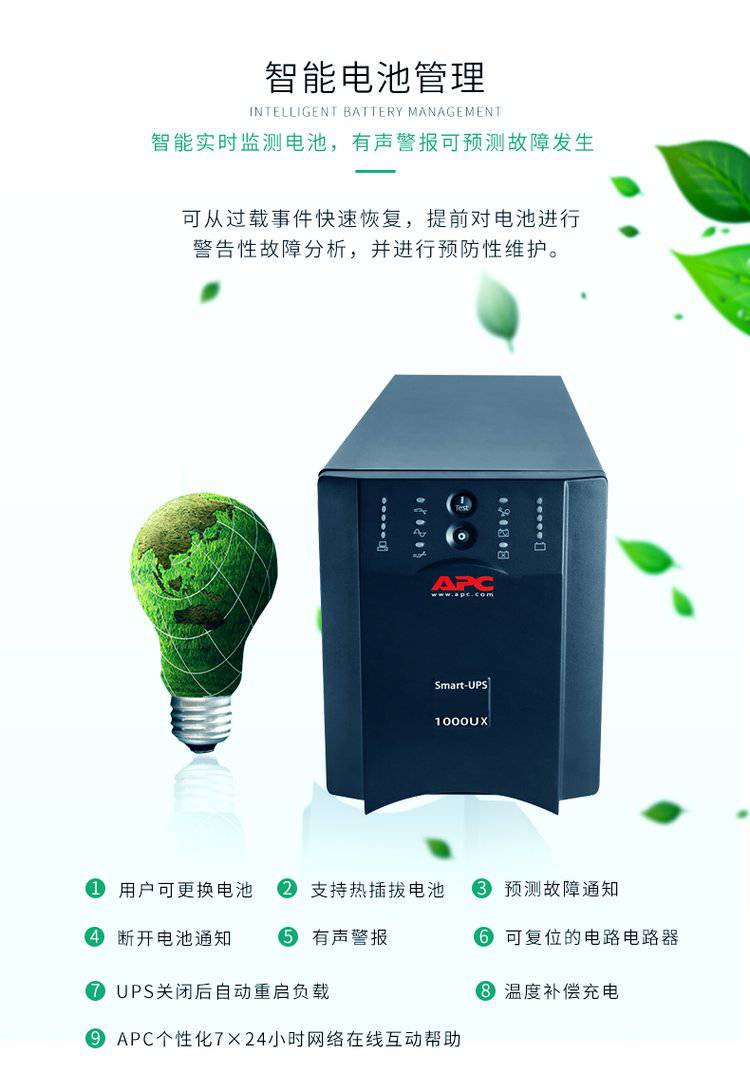获得专利的绿色运行模式能够实现超过97%的效率。Smart-UPS是个通过能源之星认证的网络UPS。由APC公司首创的智能电池管理可通过智能化、的温度补偿充电来限度地提高电池的性能并延长其寿命。动态更换电池时间指示器和自动自检能够保证电池的可靠性并可在需要更换之前事先发出警告。方便、易于连接、可热插拔的电池模块无需断电就可进行电池更换。APC公司设计和制造Smart-UPS的历史已超过23年,Smart-UPS是世界上最值得信赖的网络UPS,累计销量已超过2500万台。