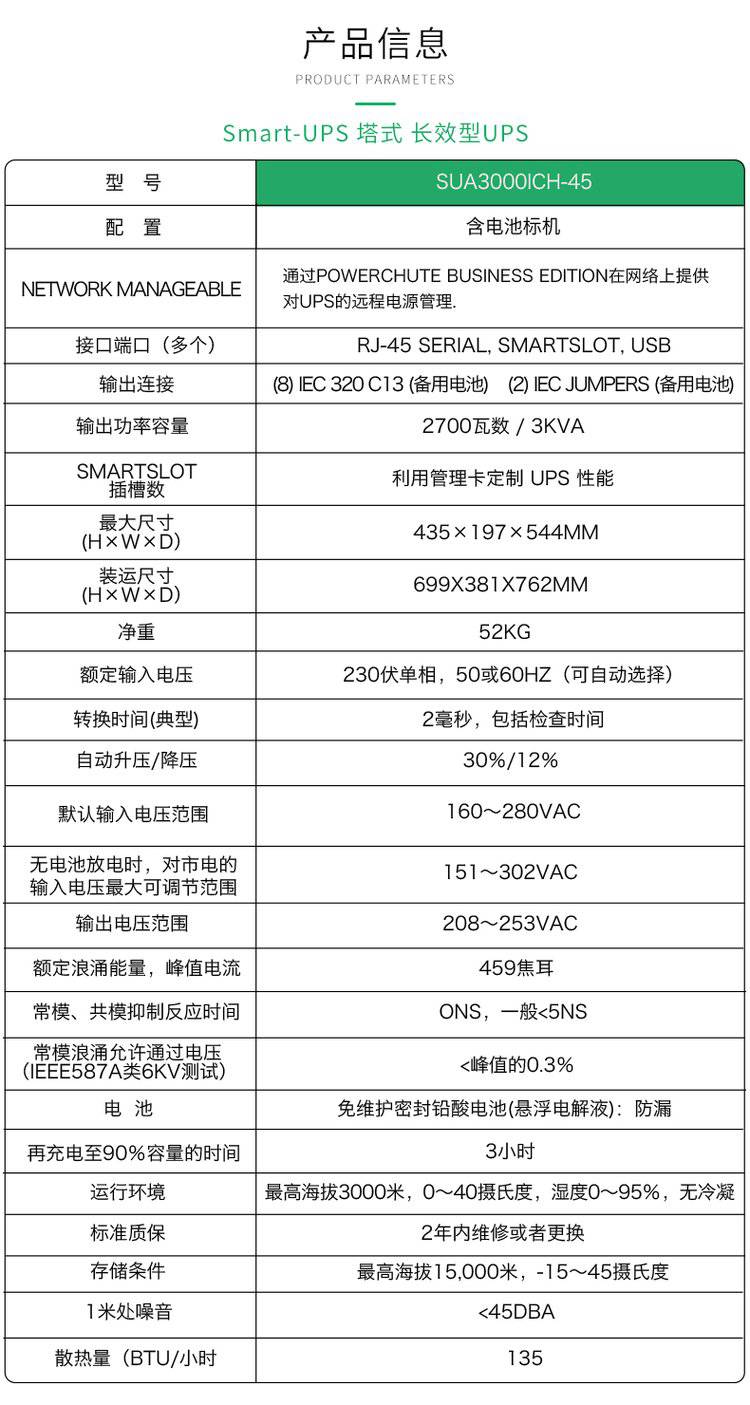 获得专利的绿色运行模式能够实现超过97%的效率。Smart-UPS是个通过能源之星认证的网络UPS。由APC公司首创的智能电池管理可通过智能化、的温度补偿充电来限度地提高电池的性能并延长其寿命。动态更换电池时间指示器和自动自检能够保证电池的可靠性并可在需要更换之前事先发出警告。方便、易于连接、可热插拔的电池模块无需断电就可进行电池更换。APC公司设计和制造Smart-UPS的历史已超过23年,Smart-UPS是世界上最值得信赖的网络UPS,累计销量已超过2500万台。