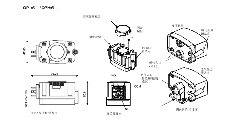 压力开关用于监测燃气或空气压力。当压力低于或超过开关设定点时, 电路将会打开或发生转换。设置需要的开关点, 卸下压力开关表盖然后顺时针旋转来增加设定值,或逆时针减少。