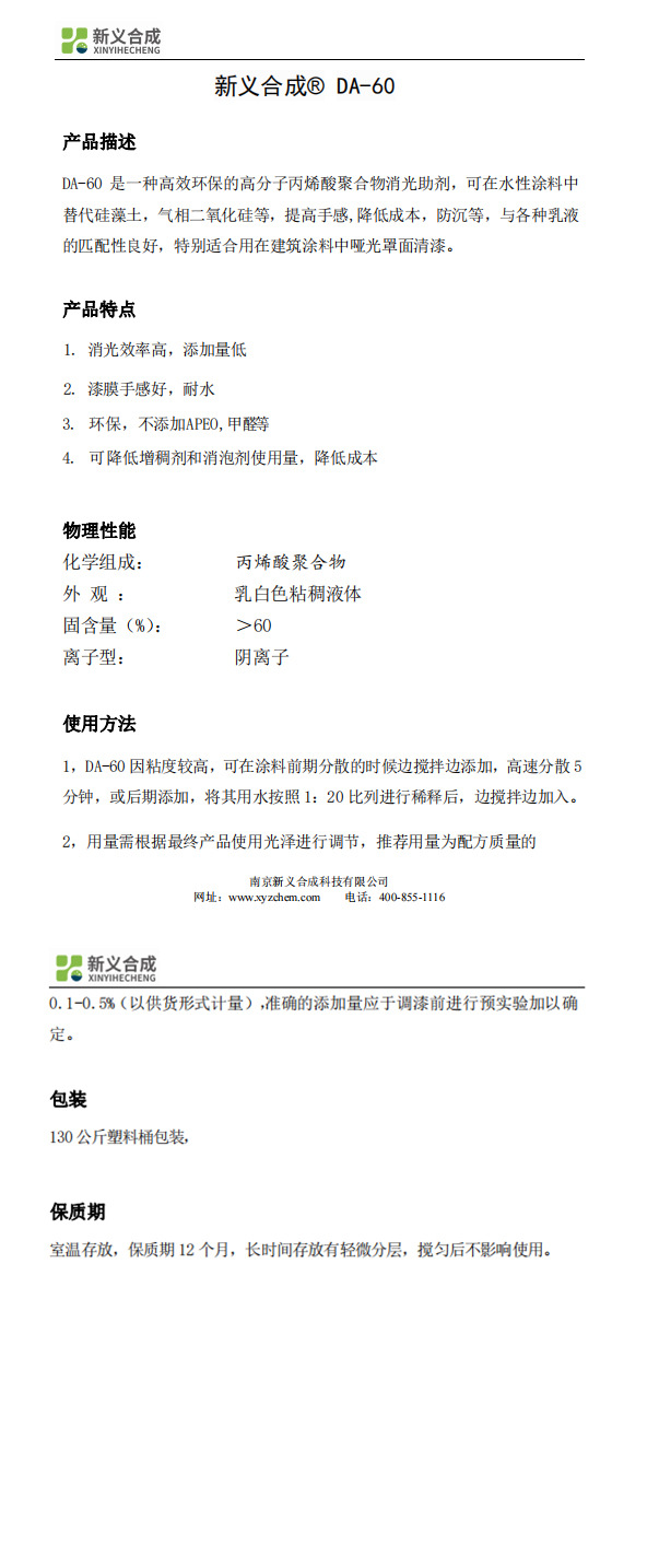 新义合成® DA-60产品描述DA-60 是一种高效环保的高分子丙烯酸聚合物消光助剂,可在水性涂料中替代硅藻土,气相二氧化硅等,提高手感,降低成本,防沉等,与各种乳液的匹配性良好,特别适合用在建筑涂料中哑光罩面清漆