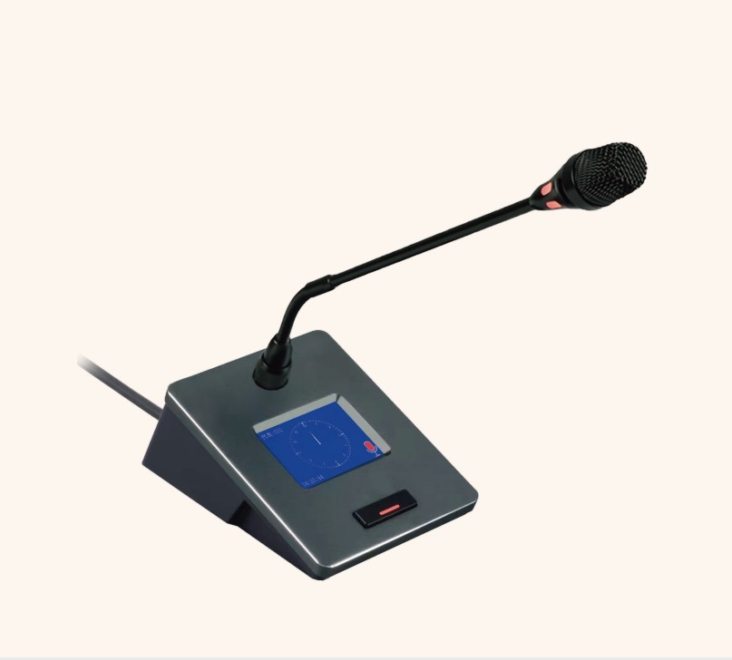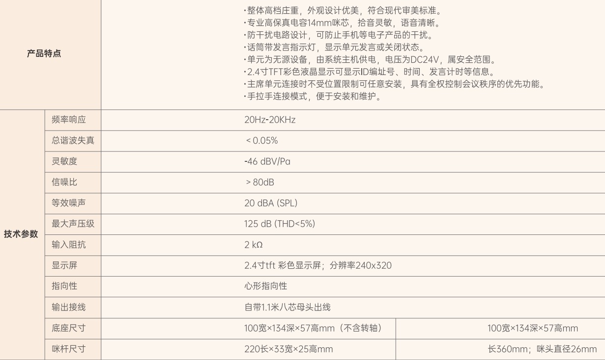 整体高档庄重,外观设计优美,符合现代审美标准高保真电容14mm咪芯,拾音灵敏,语音清晰·防干扰电路设计,可防止手机等电子产品的干扰。话筒带发言指示灯,显示单元发言或关闭状态。单元为无源设备,由系统主机供电,电压为DC24V,属安全范围,2.4寸TFT彩色液晶显示可显示ID编址号、时间、发言计时等信息。单元连接时不受位置限制可任意安装,具有全权控制会议秩序的优先功能手拉手连接模式,便于安装和维护。