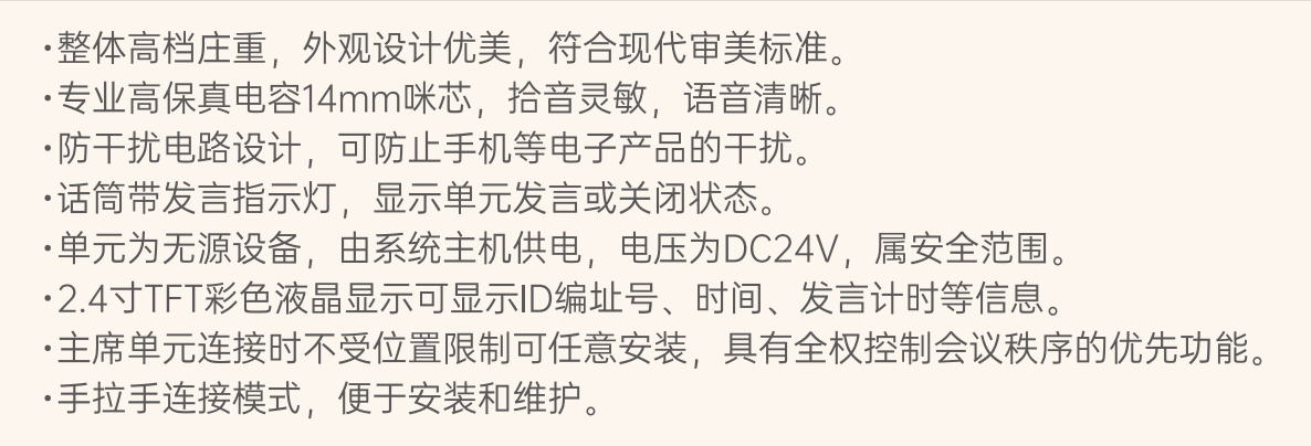 整体高档庄重,外观设计优美,符合现代审美标准,高保真电容14mm咪芯,拾音灵敏,语音清晰防干扰电路设计,可防止手机等电子产品的干扰。话筒带发言指示灯,显示单元发言或关闭状态。单元为无源设备,由系统主机供电,电压为DC24V,属安全范围:2.4寸TFT彩色液晶显示可显示ID编址号、时间、发言计时等信息。单元连接时不受位置限制可任意安装,具有全权控制会议秩序的优先功能手拉手连接模式,便于安装和维护
