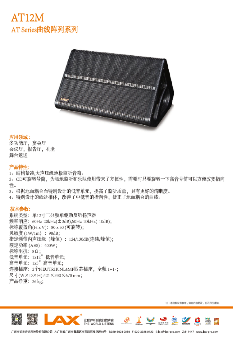 锐丰LAX AT12M 单12寸二分频单驱动反听扬声器 多功能厅会议厅专用
