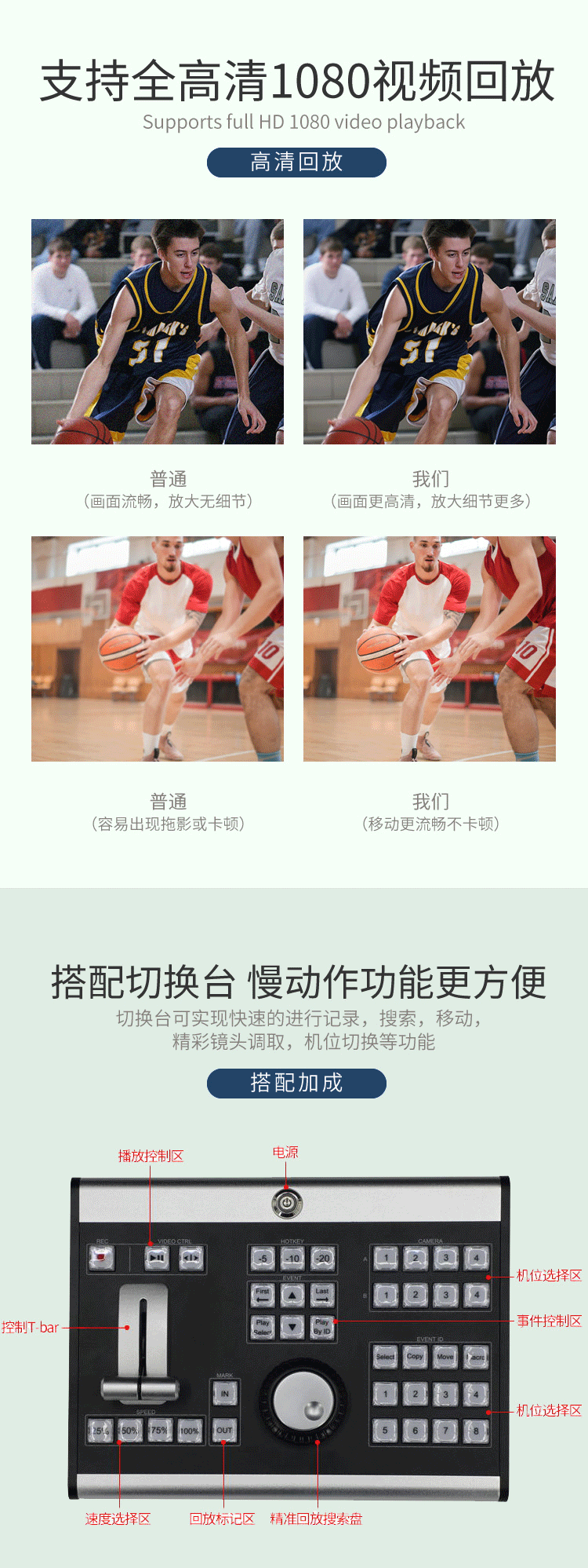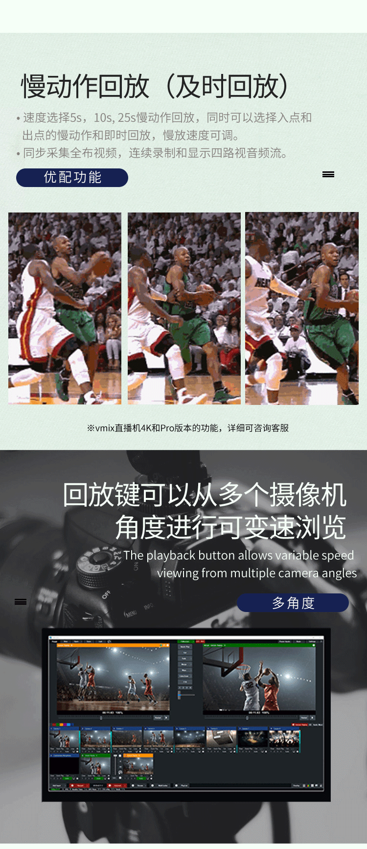 该系列慢动作回放系统,具有慢动作回放+切换台+CG字幕+录像+网络直播五合一全功能。这套系统即将把学校,地方电视台、体育比赛入一个全新的领域里,功能丰富但操作非常简单,随时可上手操作,且性价比高。