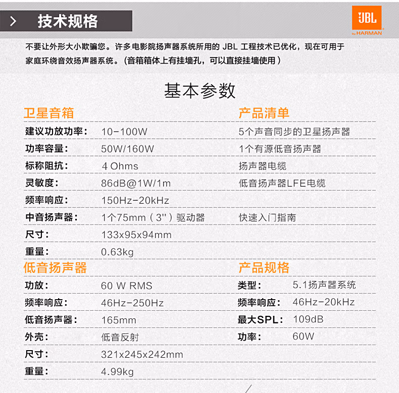 JBL CINEMA510家庭影院套装挂壁音响 510卫星套装
