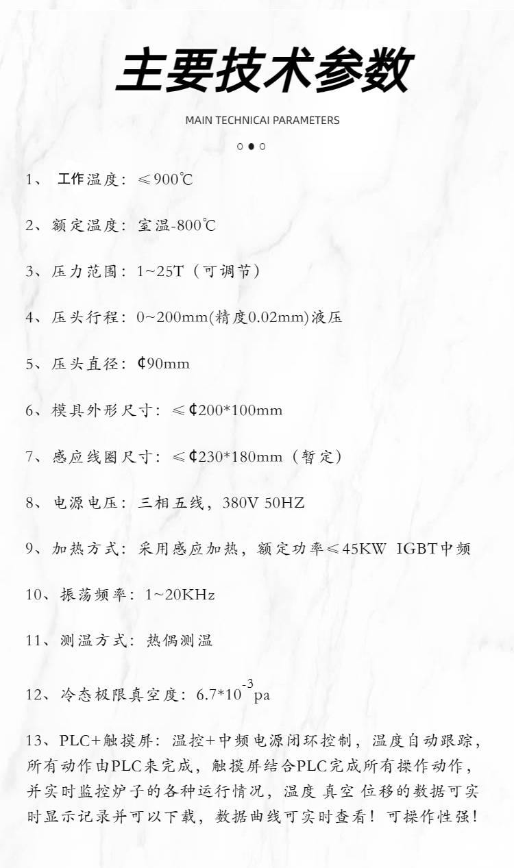 本系列真空炉为周期作业式,采用石墨管为发热元件,适用于金属材料,无机非金属材料,在真空或保护气氛下进行加压烧结适用,以便获得高致密度的产品。也可用于真空或保护气氛下进行烧结、光学材料的烧结提纯适用