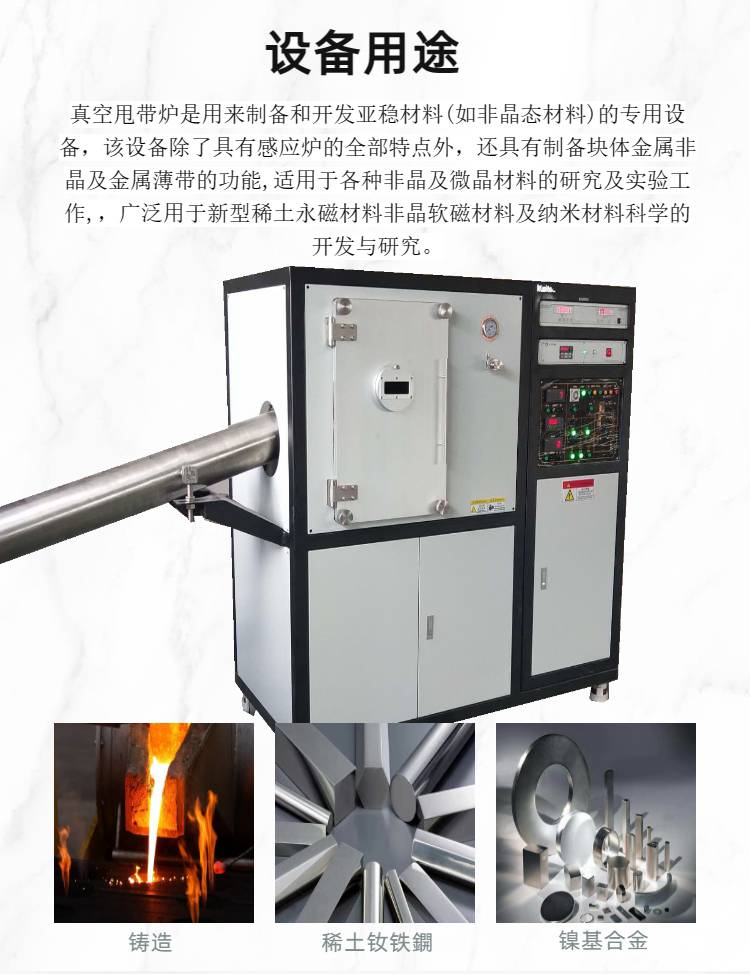 真空甩带机是用来制备和开发亚稳材料(如非晶态材料)的专用设备,该设备除了具有感应炉的全部特点外,还具有制备块体金属非晶及金属薄带的功能,适用于各种非晶及微晶材料的研究及实验工作,,广泛用于新型稀土永磁材料非晶软磁材料及纳米材料科学的开发与研究。可选配喷铸功能。