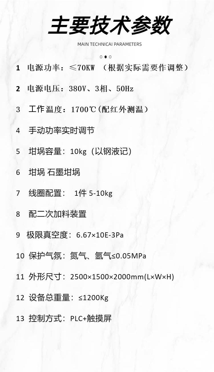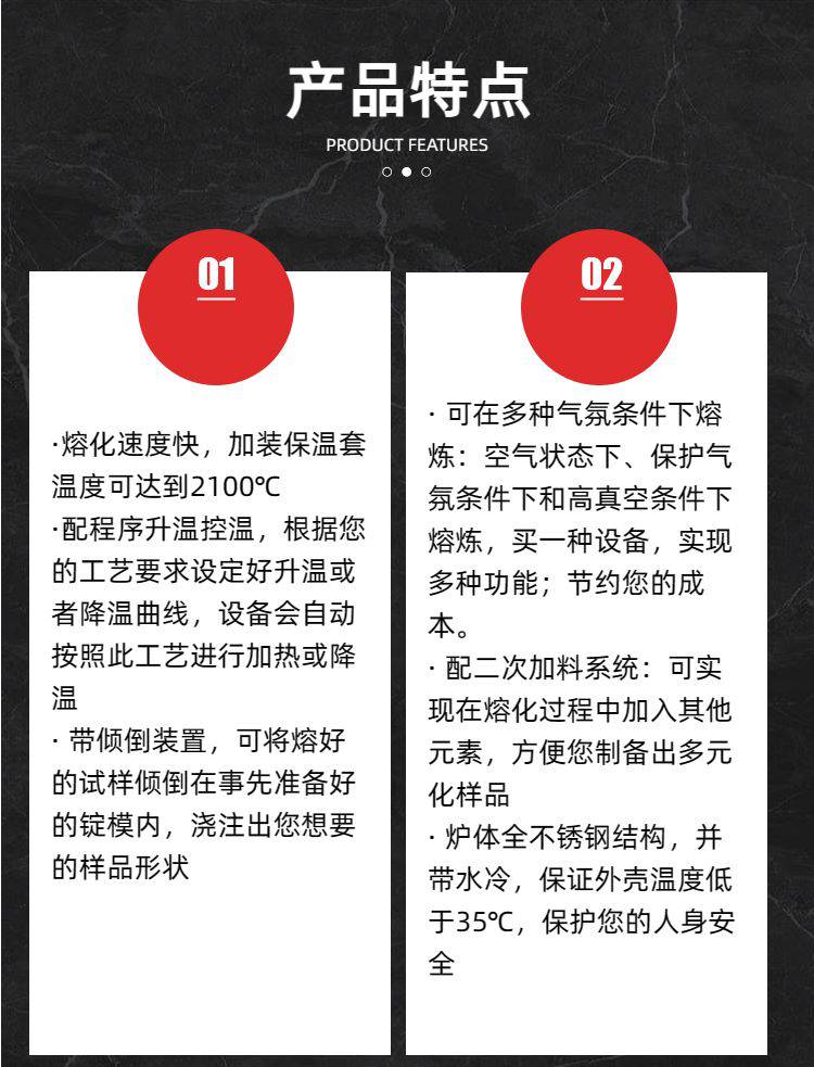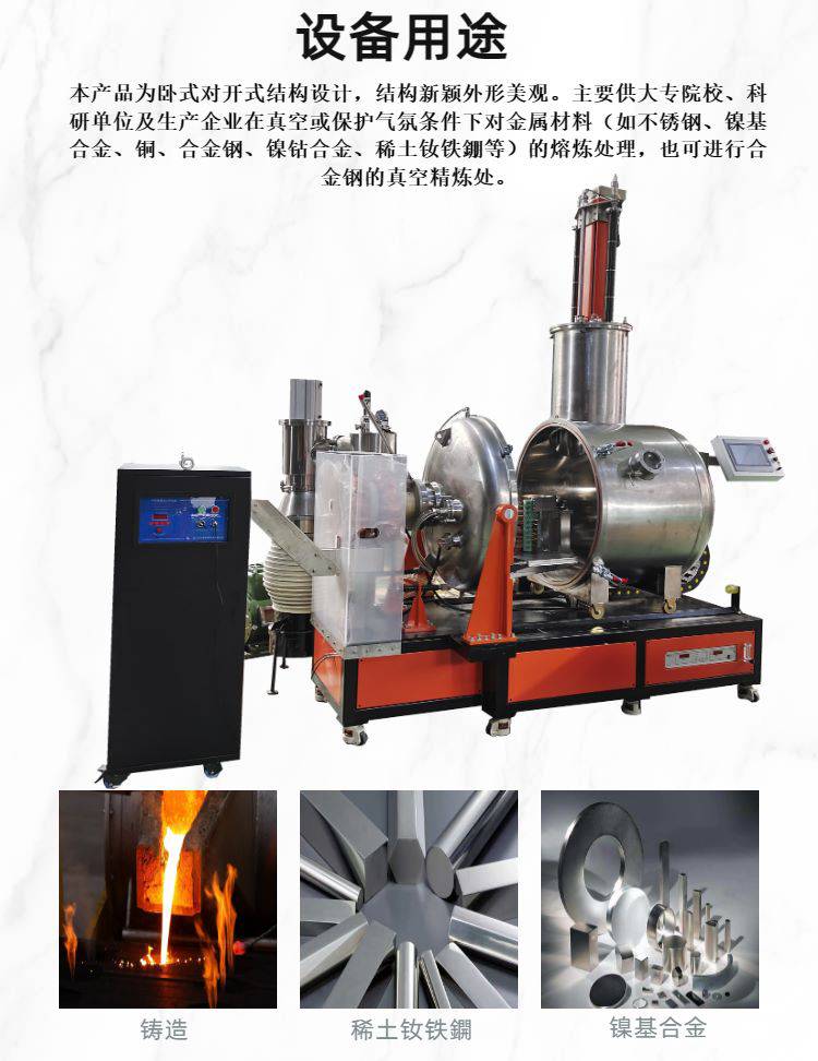本产品为卧式对开式结构设计,结构新颖外形美观。主要供大专院校、科研单位及生产企业在真空或保护气氛条件下对金属材料(如不锈钢、镍基合金、铜、合金钢、镍钴合金、稀土钕铁錋等)的熔炼处理,也可进行合金钢的真空精炼