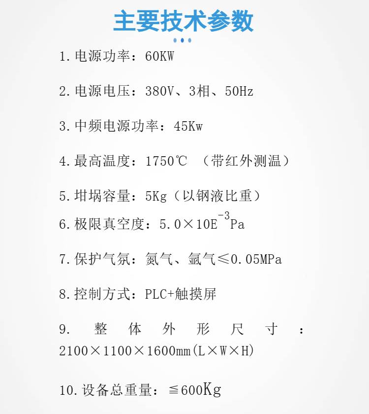 本产品为卧式对开式结构设计,结构新颖外形美观。主要供大专院校、科研单位及生产企业在真空或保护气氛条件下对金属材料(如不锈钢、镍基合金、铜、合金钢、镍钴合金、稀土钕铁錋等)的熔炼处理,也可进行合金钢的真空精炼处理。