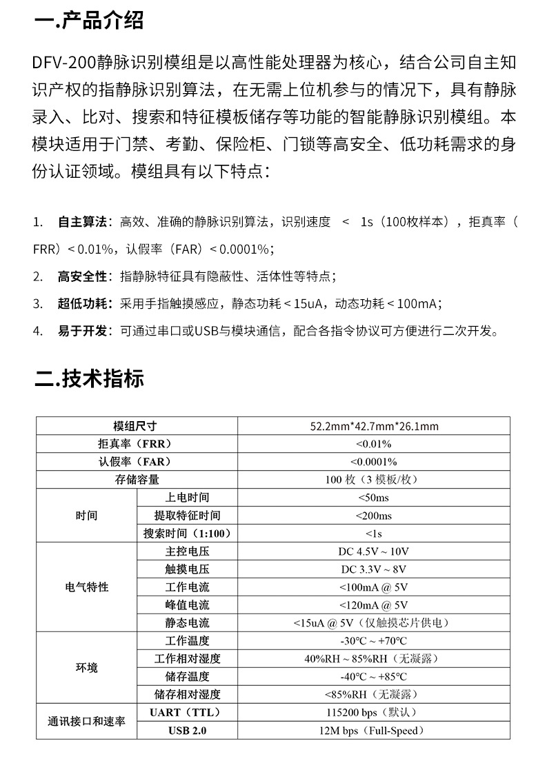 静脉识别模块是以高性能处理器为核心,结合公司自主知识产权的指静脉识别算法,在无需上位机参与的情况下,具有静脉录入、比对、搜索和特征模板储存等功能的智能静脉识别模块。本模块适用于门禁、考勤、柜、门锁等高安全、低功耗需求的身份认证领域。