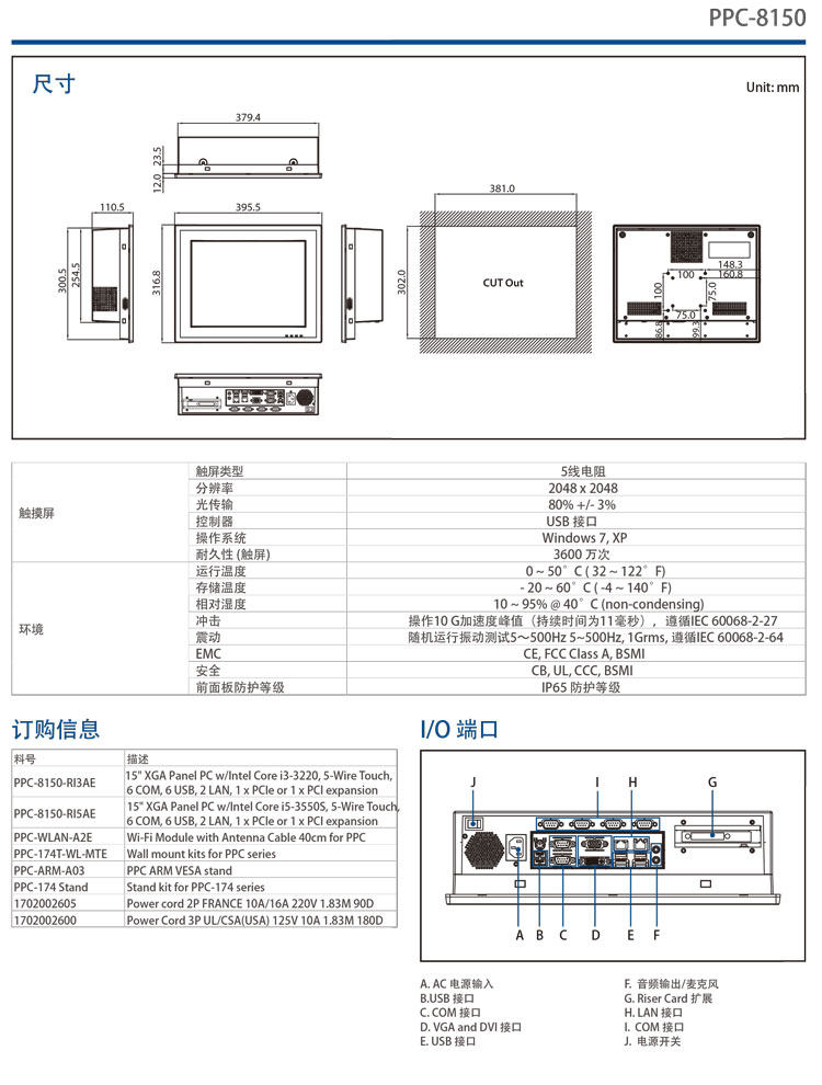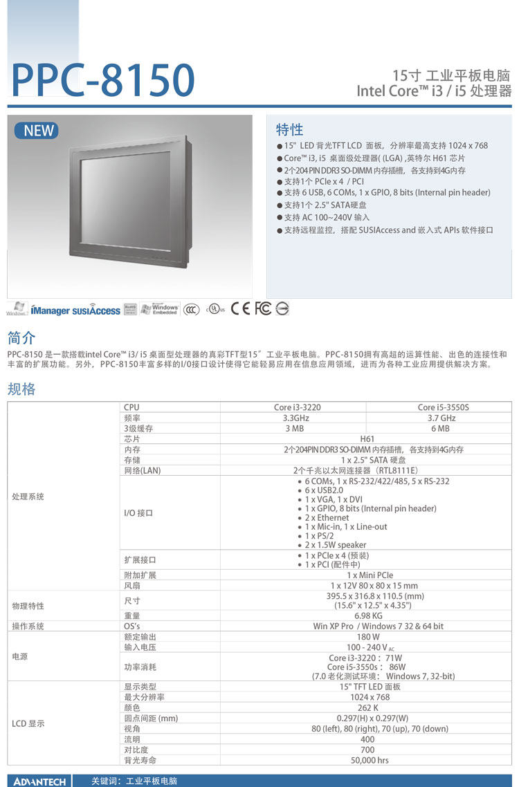 15" TFT LED 面板,分辨率支持1024 x 768
