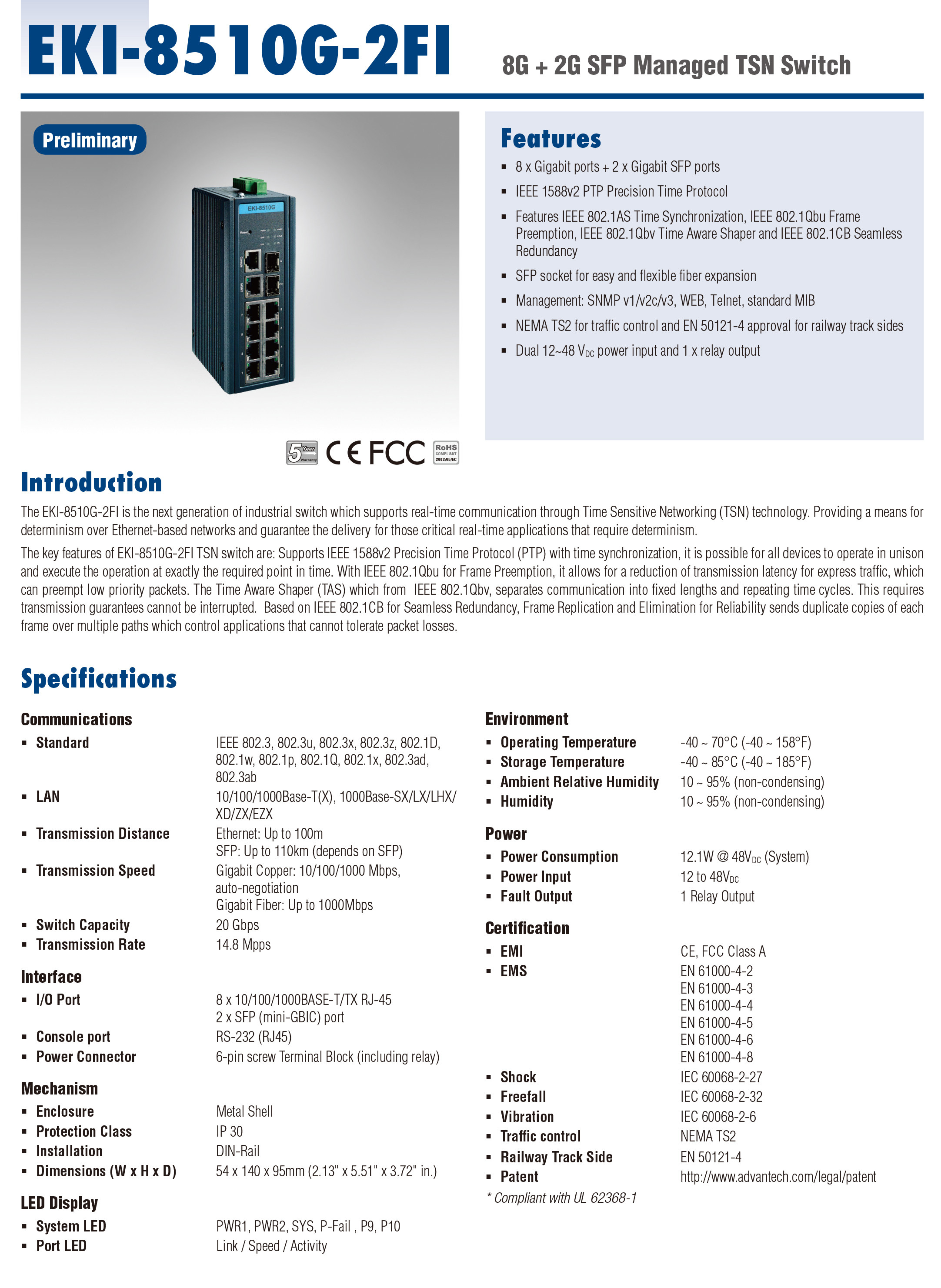 EKI-8510G-2FI是下一代工业交换机,支持通过时间敏感网络(TSN)技术进行实时通信。为基于以太网的网络提供确定性手段,并保证关键实时应用程序的交付。