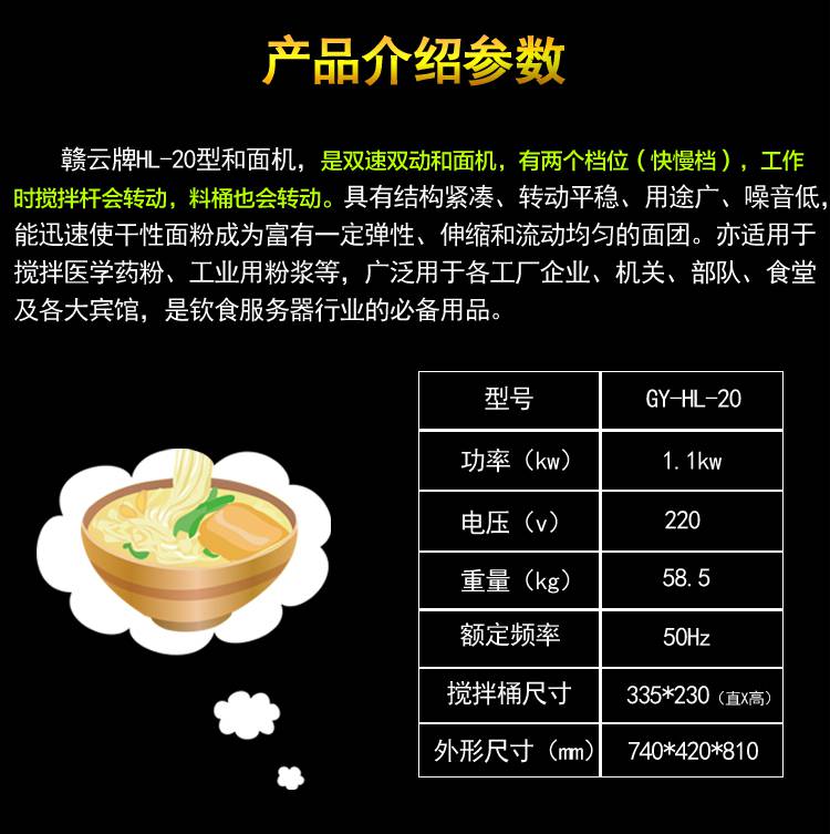 1:赣云20型双速双动和面机整体采用不锈钢精心制造,外表美观大方,坚固耐用,清洗方便,不易腐蚀;大功率纯铜电机,动力强劲,运行稳定,使用寿命长;