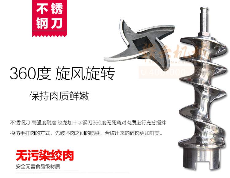 2:本机采用大功率纯铜电机,动力强劲,运行稳定,使用寿命长,绞肉强度更高,碎肉快速,不损坏肉质纤维。每小时可绞肉600KG。