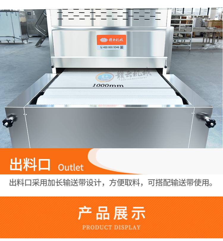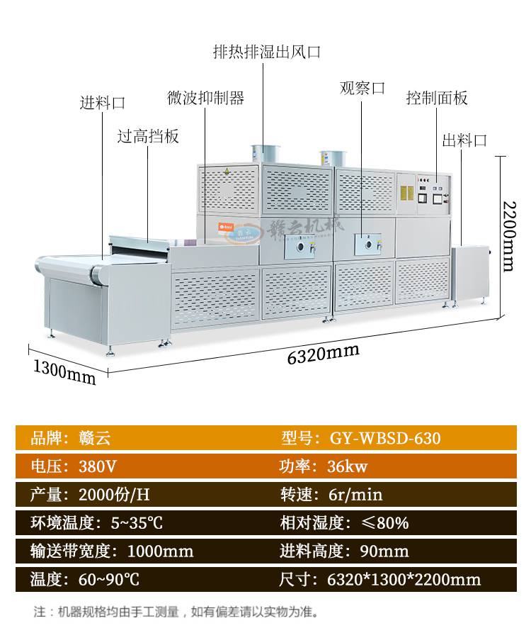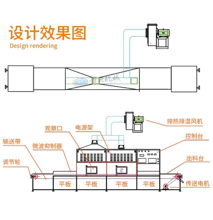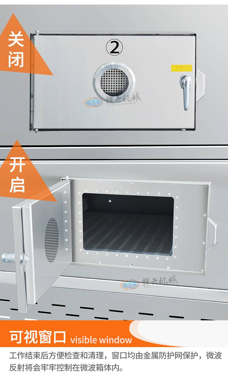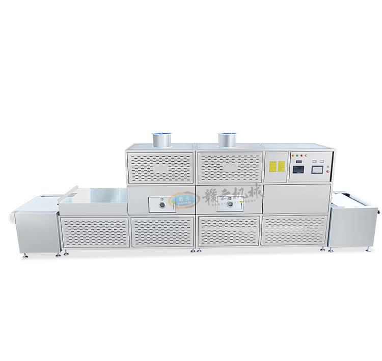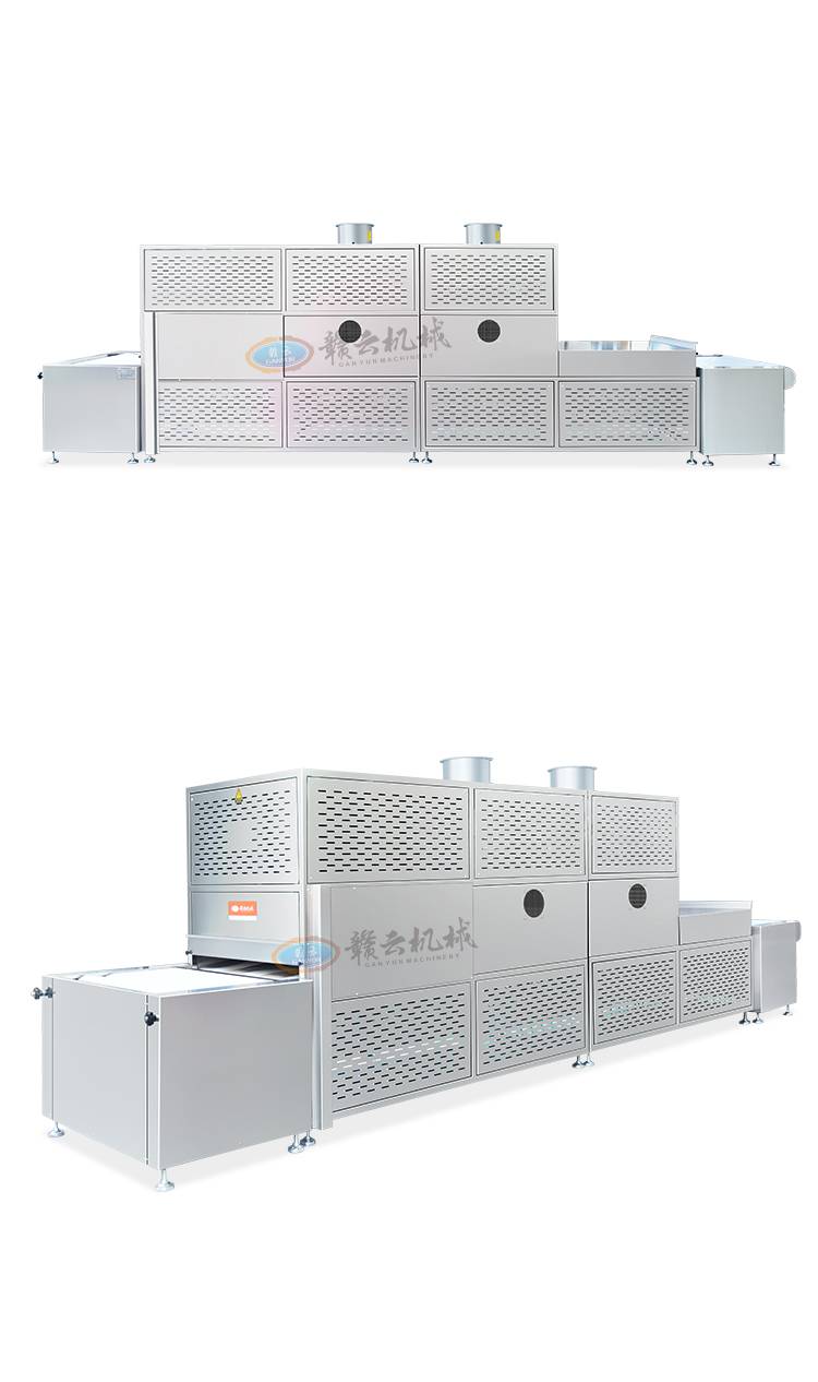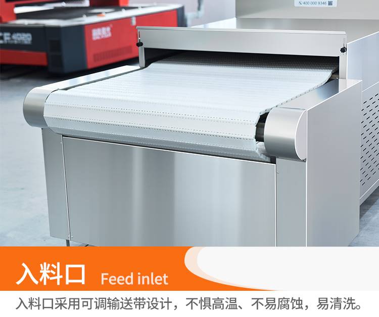 连续式微波加热隧道可以在短时间内批量对食物加热,机器分别由微波发生器,共振腔,连续输送,控制单元组成,微波发生器由30组磁控管均匀平铺于共振腔上方,紧邻的共振腔四周采用不锈钢材料制造,在捕获微波的同时,利用金属反射特性,同时增强了微波的强度,在下方采用PP材质连续式移动,实现从入料,加热,出料的闭环,设备的控制单元分别可根据共振腔内的监控画面及温度开启排湿,输送带速度,磁控管启停功能,设备开启后整个过程可实现连续批量加热,比传统加热方式用时短,加热均匀,营养流失少,物理杀菌等特点。
