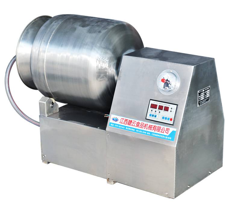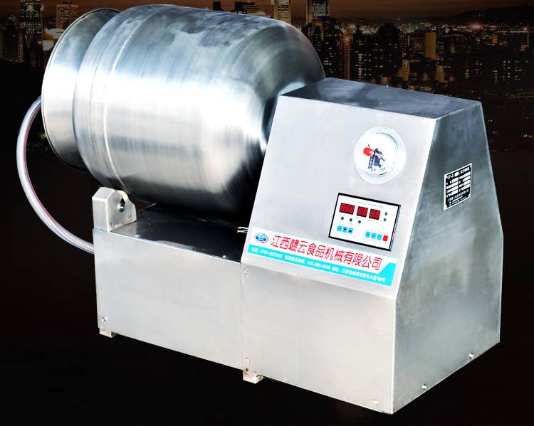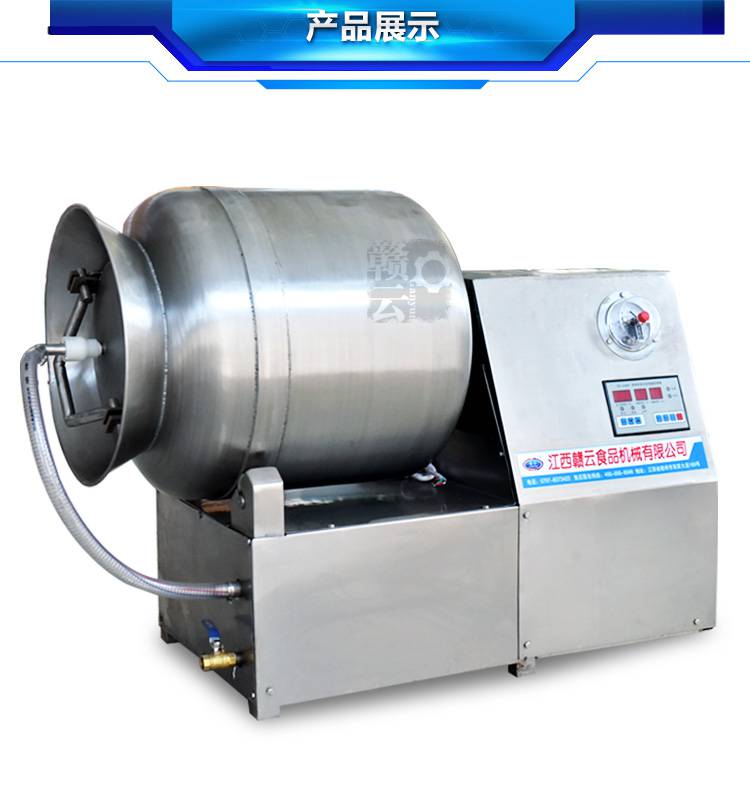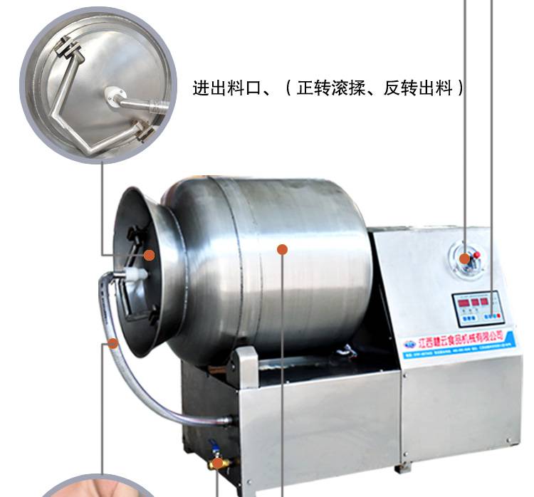 赣云牌200L真空滚揉机其实就是通过滚筒的快速滚动,让桶里的肉料翻转,撞击,使肉均匀的吸收,快速腌制入味,使用真空翻转不易损坏肉质,并且增加肉的结合力,提高肉的弹性,可以改善肉的口感,让肉料腌制入骨;时间,转向,可根据食物不同随心选择;