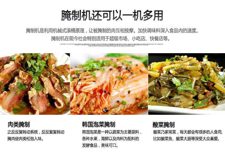 1:本机通用性强,适用范围广,可以用于鸡胸肉,牛排,鸡翅,牛肉,腌菜,鱼肉等肉制品,腌制品的腌制加工,用这款设备腌制出来的食材更快速,更入味,口感更有弹性;深受消费者的喜爱;