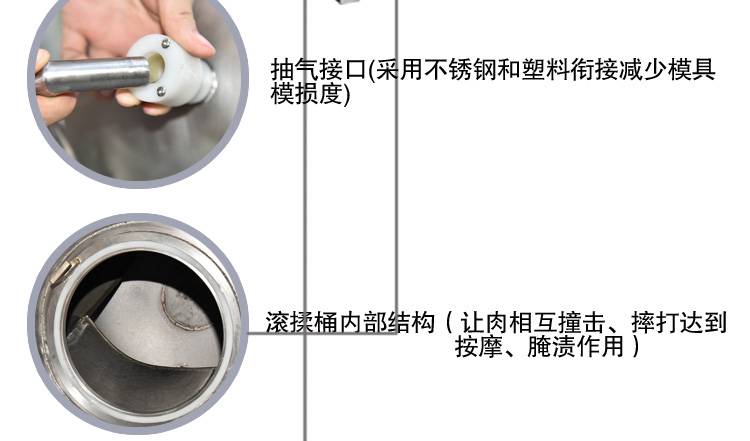 5:真空滚揉桶采用8MM加厚不锈钢喷砂工艺,配上加大进出口,在真空搅拌下入味更充分;接料加长滑斗很好的将物料送至收料盒内,不易散落;