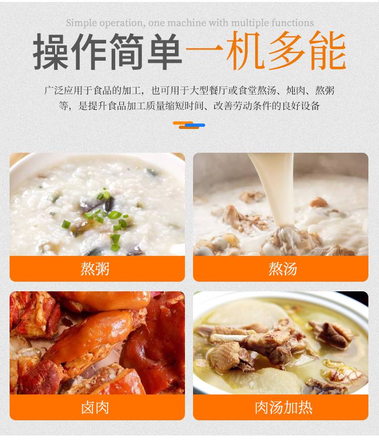 1:本机操作简单,一机多能,广泛用于食品的加工,也可以用于大型餐厅或食堂熬汤,炖肉,熬粥等,是提升食品加工质量,缩短时间,改善劳动条件的理想设备。