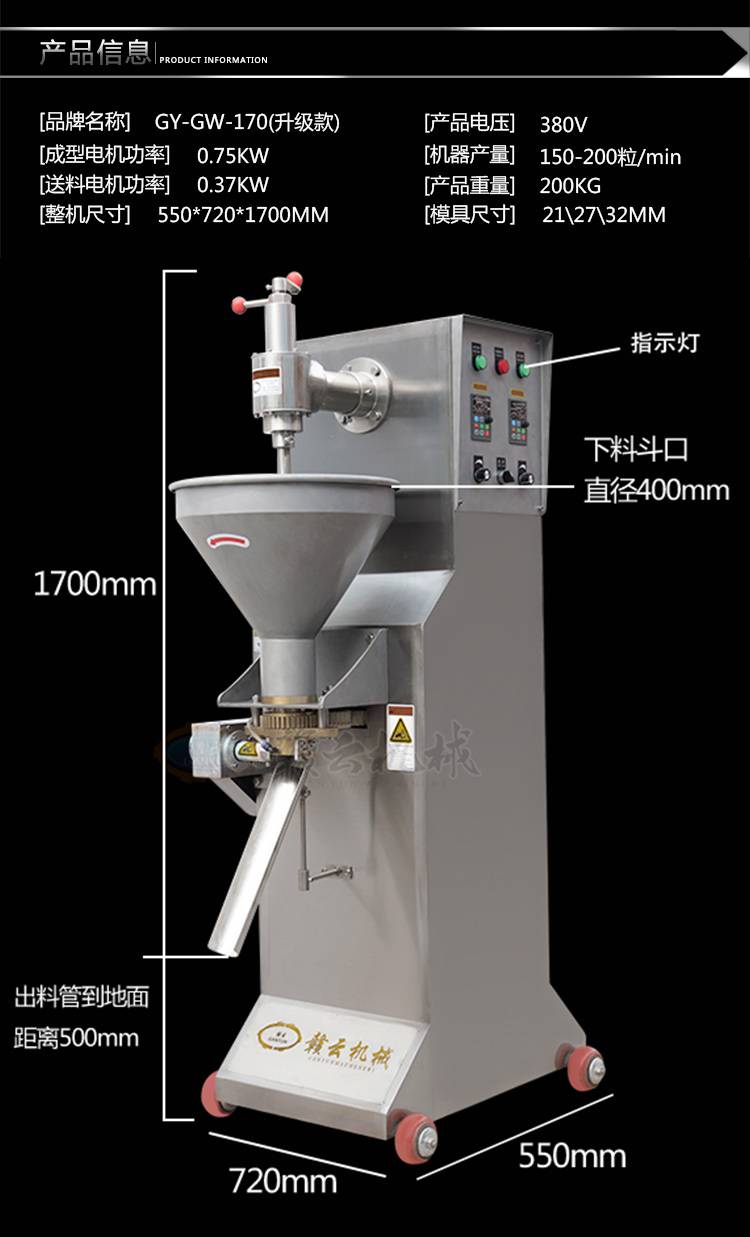 1:赣云170贡丸成型机是江西赣云食品机械有限公司生产的一款数字变频挖勺式贡丸成型机;这款成型机是可以用于贡丸,牛肉丸,猪肉丸,鱼丸等肉丸成型;