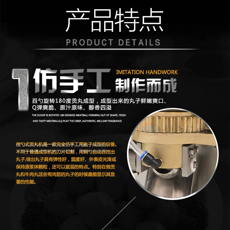 2:仿手工制作挖勺成型,成型圆度好,外表光滑,弹性好,还保持了原有的颗粒感适用于肉丸加工厂,半成品配送中心,肉丸加工门市等肉丸加工单位;
