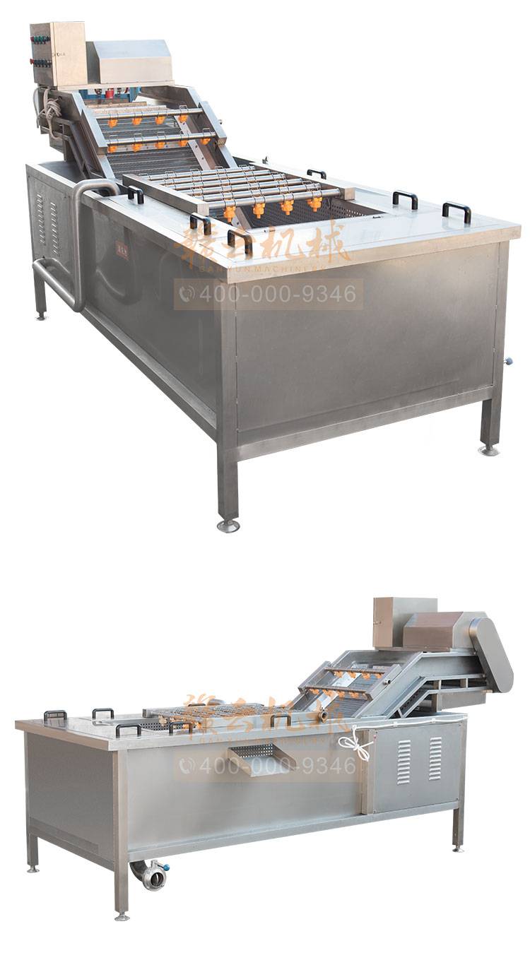 本机机器工作时,利用箱体前部分设备箱体中注入适量的水,经过加热管将水温加热,原料在经过箱体时,会与气泡机和水的结合作用下做翻滚状态,并随网带不断向前推进,在出水面时,设有喷淋头,进行高压冲洗。
