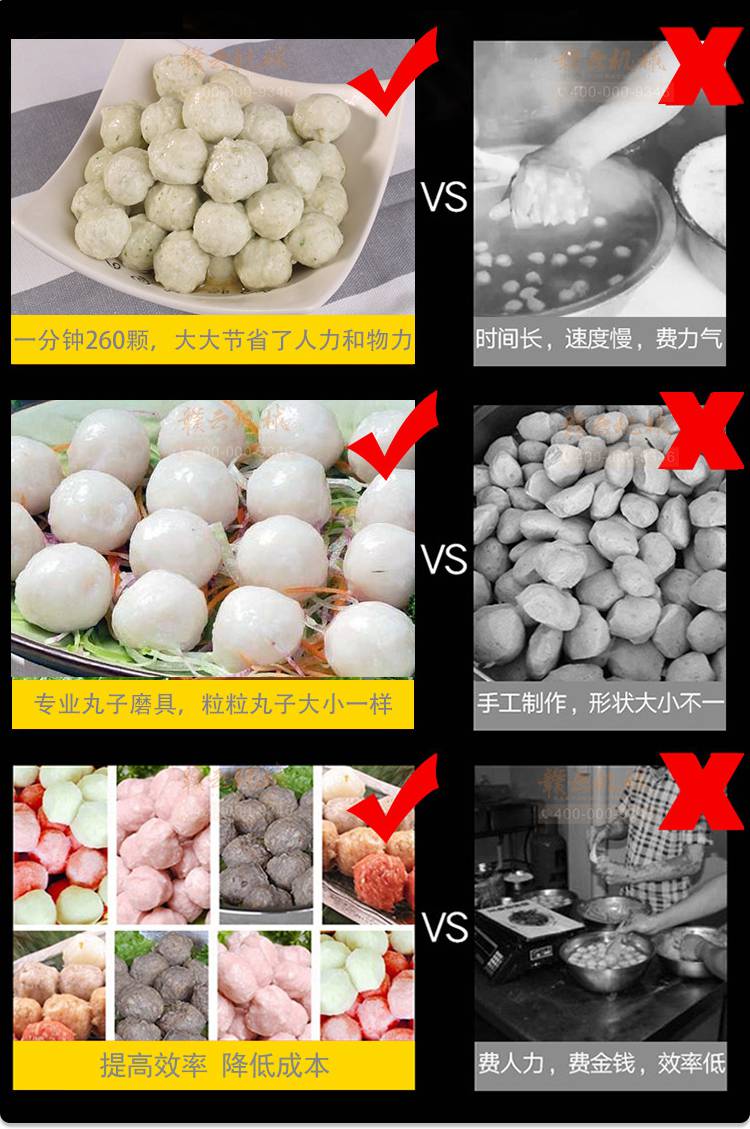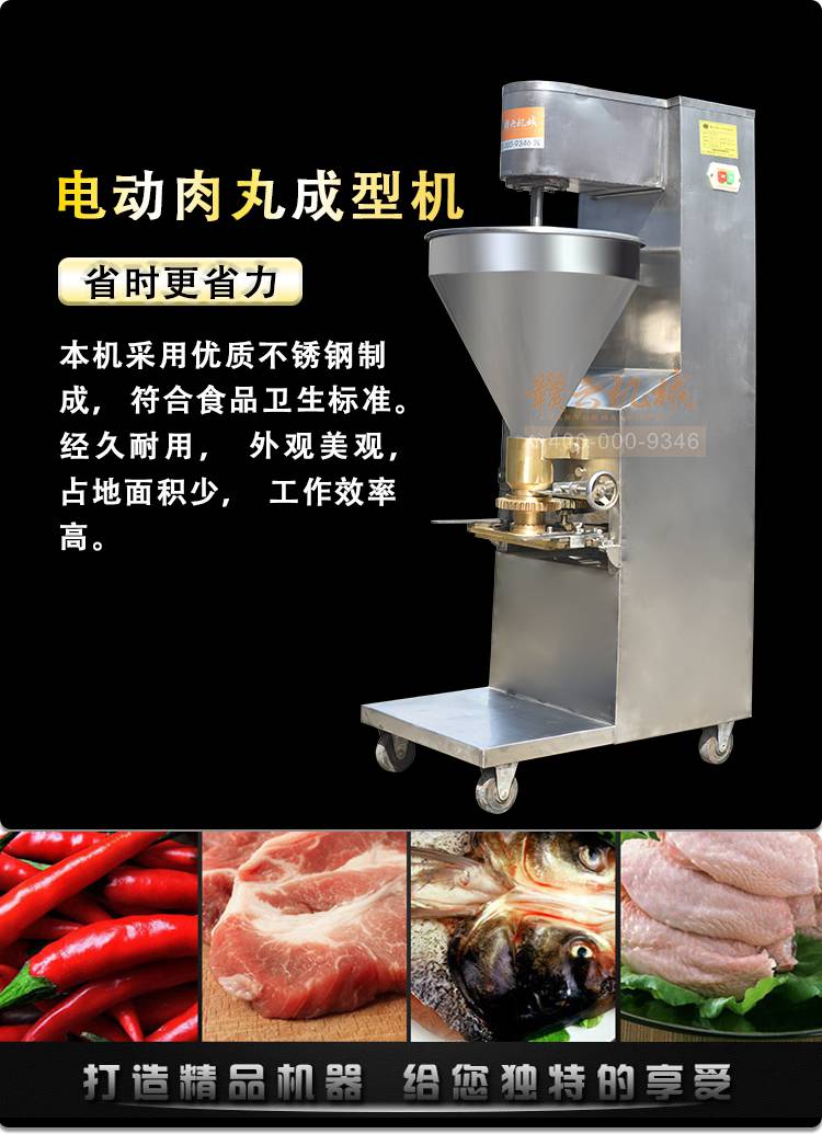 这是一款商用的小型肉丸机,这款机器不仅可以做猪肉丸,还可以做牛肉丸,鱼丸,贡丸等肉丸,机器操作简单,使用方便,一分钟可以成型肉丸200粒,成型的肉丸圆度好,表面光滑,克重均匀,大小统一。