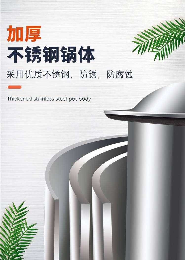 4:加厚不锈钢锅体,防止锈蚀,防止腐蚀。食品级不锈钢,安全可靠,食用更放心,易清洗。