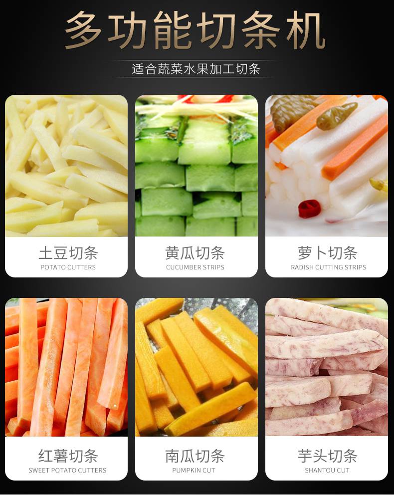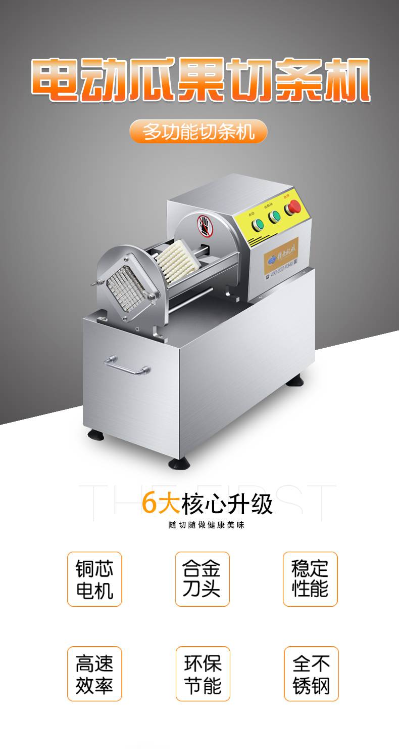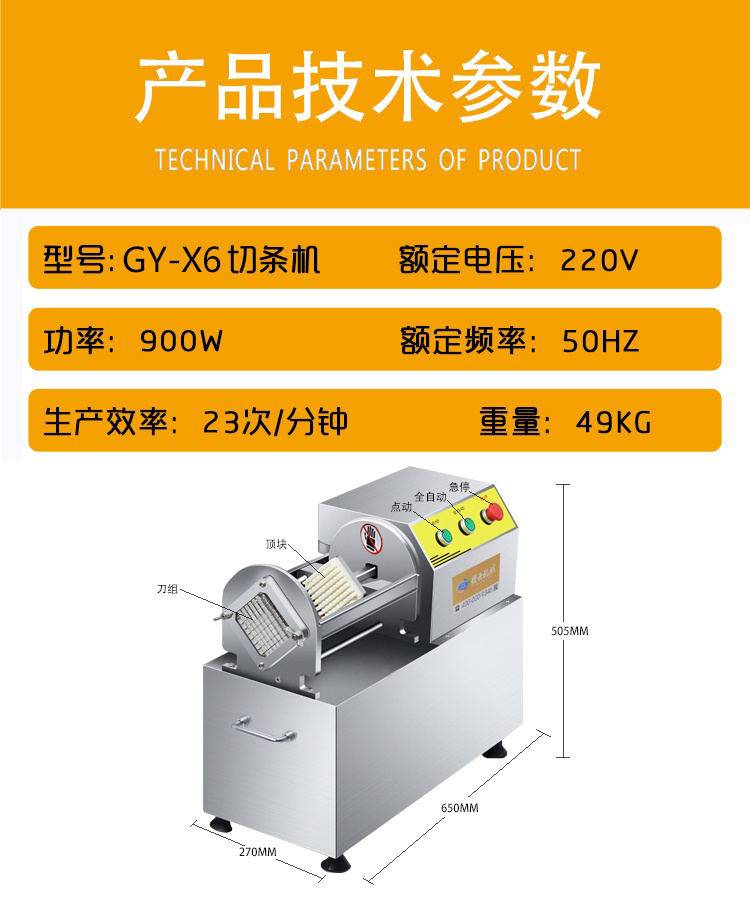 2:切条损耗小,厚薄均匀,大小统一,不损坏果蔬纤维组织;适用于酒店厨房,中餐店,西餐店,家庭等环境;
