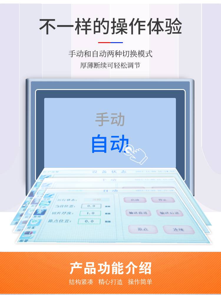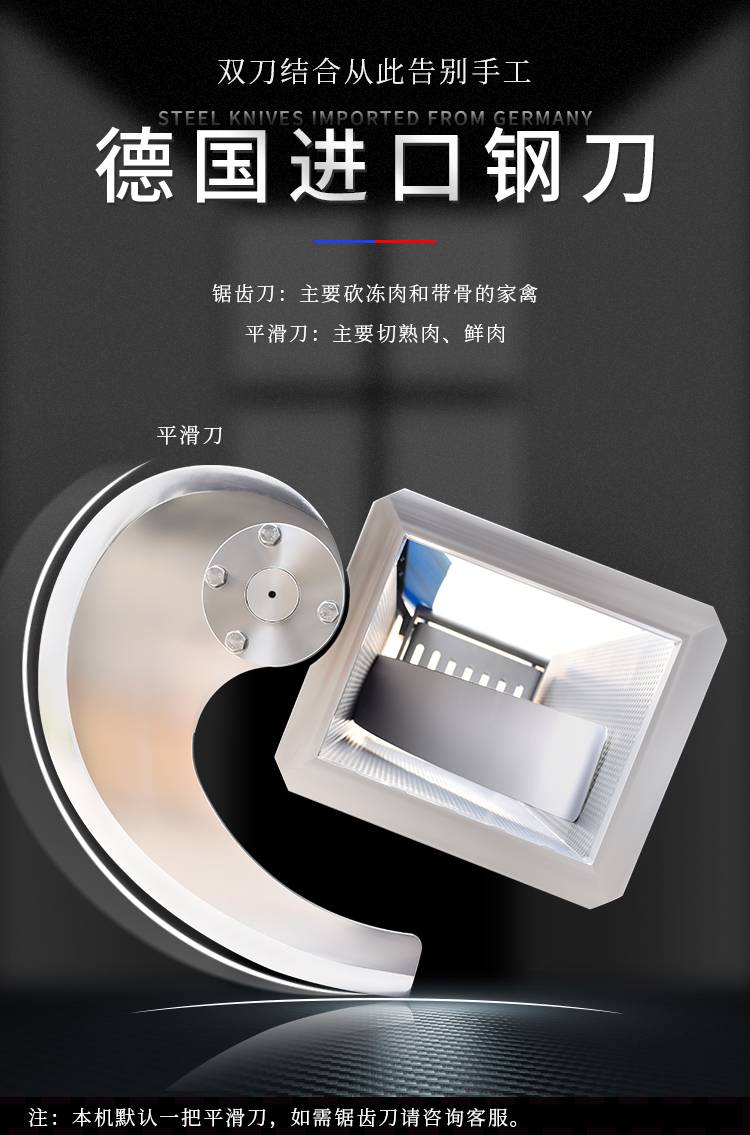 1:这款设备不仅可以对鲜肉,熟肉,冻肉切割成片,还可以切玉米,黄瓜,萝卜等根茎类果蔬;更换锯齿刀组还可以用于冻肉骨,带骨禽类进行剁骨,切块加工工序;一机多用,省时省力;